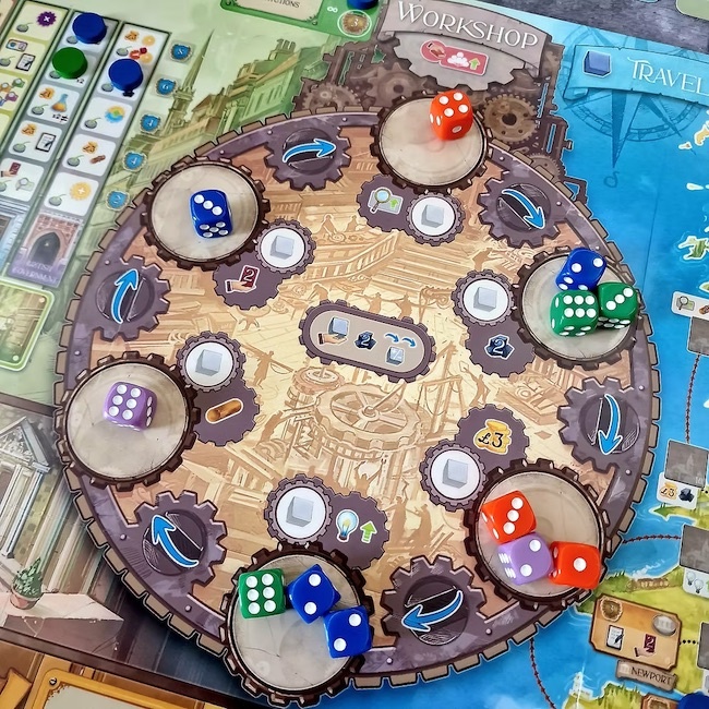 Over the course of the game (18 turns), players take dice from the Workshop Rondel, Give Lectures in Prestigious Institutions, Travel the UK, and Complete Assignments from Ada to gather Prestige Points.