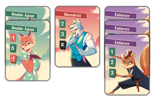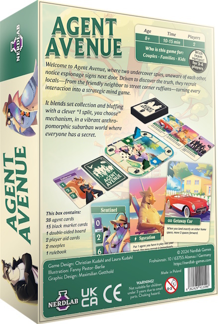 Agent Avenue is a competitive card game that combines bluffing, strategic set collection, and a race to uncover your opponent's identity. Set in a colorful anthropomorphic world, players assume the roles of retired spies in a suburban neighborhood, outsmarting each other with cards that can score points or trigger special effects. The game's art brings to life a quirky neighborhood of animal spies.