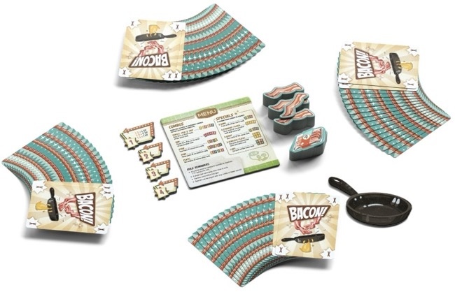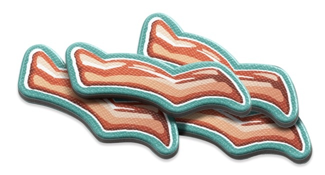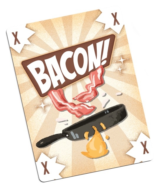 Bacon is a fixed-partnership climbing game for 4 or 6 players that is all about going out early as a team. The only team that scores is the team that goes out first. That said, their score depends on when their partner also goes out (more points if the partner goes out quickly). If your team does NOT go out first, your job is simple: make the other team go out as late as possible!