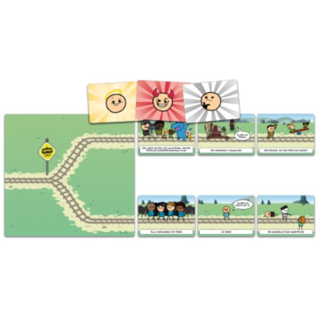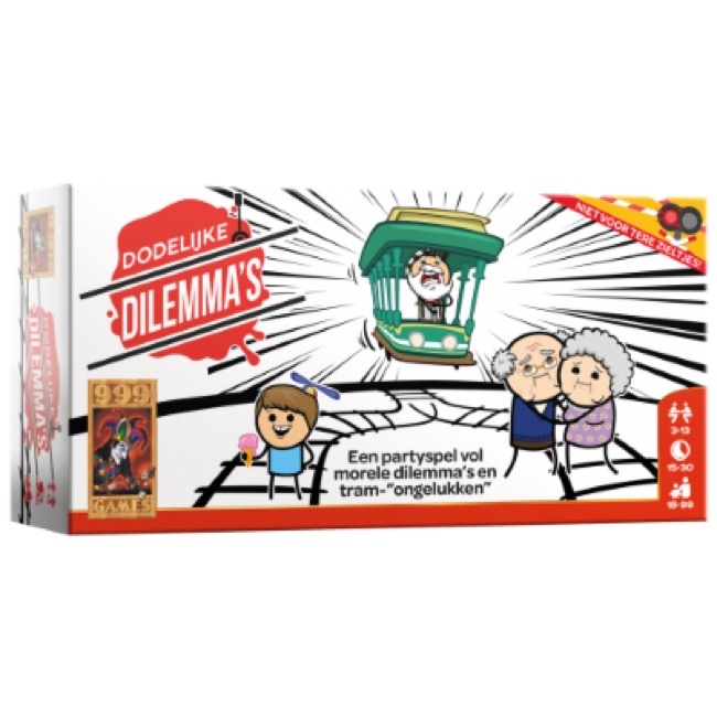 Dodelijke Dilemma’s is een spel boordevol zwarte humor voor 3-13 spelers. Eén speler is de conducteur en moet kiezen in welke richting hij zijn op hol geslagen, moordzuchtige tram heen stuurt. De andere spelers spelen hun kaarten en ruziën om de conducteur te overtuigen hun leven te sparen en iedereen op het andere spoor te veroordelen tot een gruwelijke terdoodveroordeling. Bij hun eigen spoor leggen ze goedaardige schepsels zoals een eenzaam katje dat net is geadopteerd. leggen ze aan het andere spoor een duivels karakter. Robot Hitler bijvoorbeeld. Het is aan de conducteur om als rechter/beul een oordeel te vellen over dit Dodelijke Dilemma en te beslissen welk spoor wordt vermoord. Het team dat de tramrails heeft gelegd die gespaard is, wint de ronde!