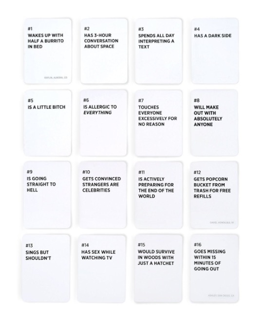 First a player declares themselves the judge and reads a card aloud. Each person then says who in the group should be tagged with this card and why.