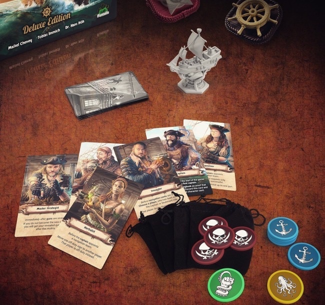 The goal of the game is to navigate the ship towards your final destination, which would be easy if only players weren’t divided into three different factions. Each secret faction wants to reach a different area of the board. Every turn the ship will sail in one of the three possible directions —but which one will it be? The current captain and their chosen lieutenant will study ancient sea maps and pass their often conflicting orders onto the chosen navigator, who has to make the final decision. Meanwhile the rest of the crew is busy drinking rum, gambling and telling each other tales of ancient sea monsters.