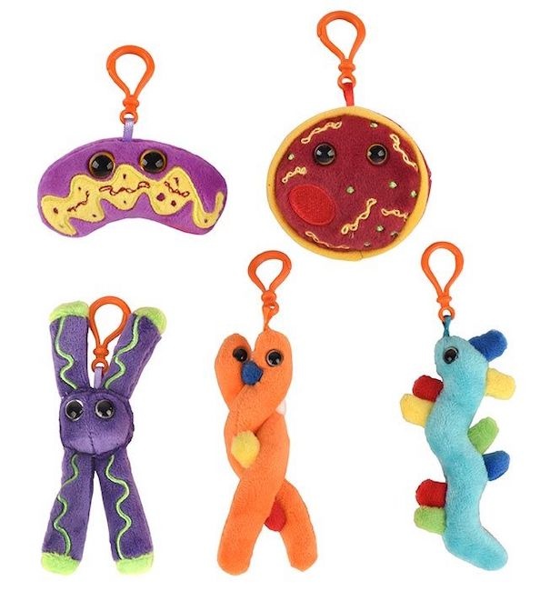 Genetics themed gift box includes these 8cm mini microbe key rings: DNA, Nucleus, Mitochondria, RNA and Chromosome. Educational information on back.