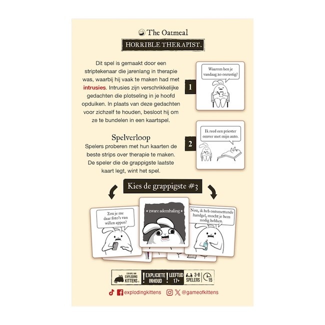 Horrible Therapist – NL is een humoristisch en uitdagend kaartspel van de makers van Exploding Kittens. In dit spel kruipen je in de huid van een therapeut. De patiënten komen langs met de meest absurde problemen. Daarom moet jij als speler de beste, of juist de meest verschrikkelijke, adviezen geven. De dynamiek tussen de spelers zorgt direct voor veel gelach aan de tafel. Omdat de scenario’s erg gevarieerd zijn, blijft het spel elke keer weer verrassend.