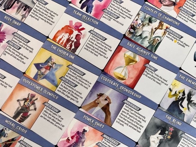 Origin Story is a 1-5 player competitive tableau-building, trick-taking game played over 5 rounds. Each round represents a chapter in your development and grants a new card to add to your player mat. Charge your cards and use their abilities to score more points than your opponents.