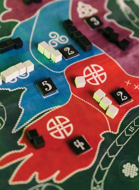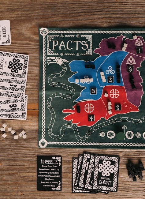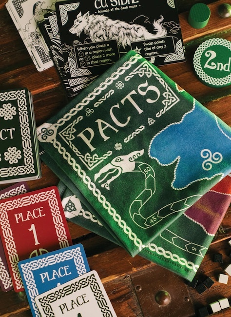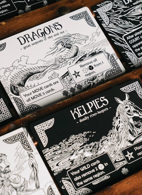 In Pacts, you shall rule one of these two courts, facing your eternal opponent in a duel of wits. Before starting, each of you will gain the assistance of mythological creatures such as dragons, banshees, and selkies to give you the edge. Each round, cards are dealt, where one player will split the possible actions between two piles, while the other will select who gets which set. You will each place, move, and remove influence across six regions and see who rules these sacred places, seeking majority control. The player who scores the best after three and six rounds will be declared the new ruler of this great isle.