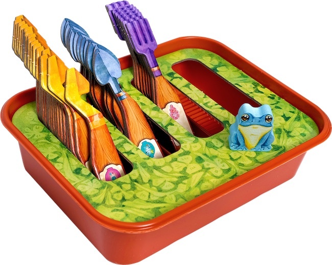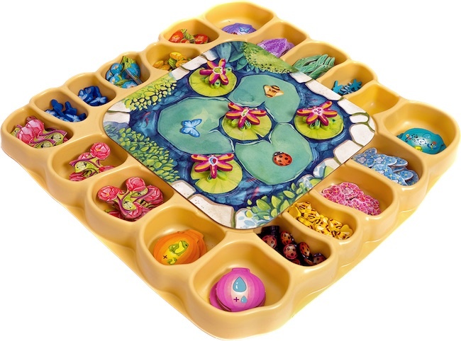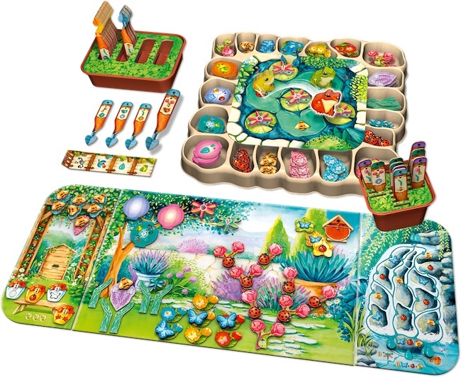 At the core of the game is the selection of gardening tools linked to specific action spaces on the action board; each tool allows players to take two elements from the supply. Although these elements can be arranged on the player’s garden board in any way, they must be placed according to certain rules to create sets and earn points at the end of the game. After placing the elements, the player performs the action corresponding to their selected tool, which can involve fluttering insects, moving a water drop, taking a leaf, or jumping their frog in the pond. The player’s turn ends with refilling the action board with a new tool and placing the used tool in their tool pot.