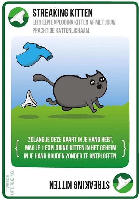 Streaking Kittens is de tweede uitbreidingsset van het populaire kickstarter kaartspel Exploding Kittens. Met 15 nieuwe kaarten, waaronder 8 nieuwe actiekaarten en 1 Streaking Kitten, wordt het spel nóg uitdagender! Met de Streaking Kitten mag je een Exploding Kitten in je hand houden zonder dat je ontploft...