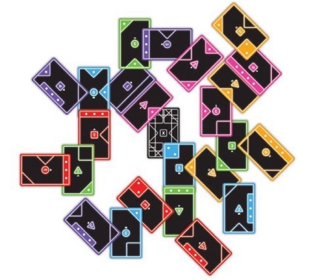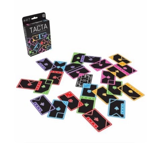 It’s all connected! In this sneakily strategic card game, players flip, twist, and turn their cards to align and cover their opponents’ shapes with matching squares, triangles, and rectangles. With an ever-growing board and up to six colors, light up game night with TACTA.