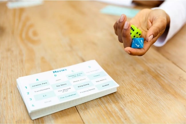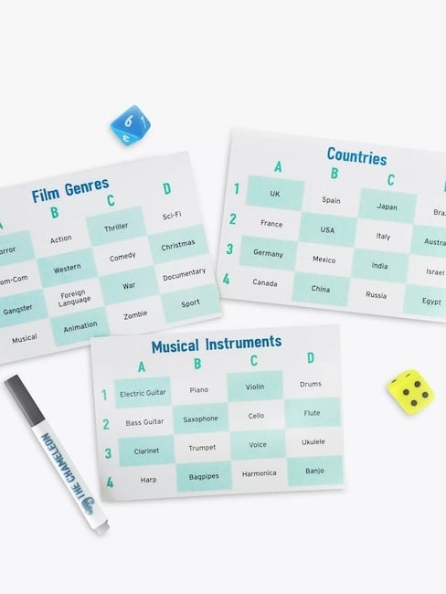 At the beginning of the round each player receives a card that tells them if they are the Chameleon or hunting the Chameleon. Two dice are rolled and this gives everyone (except the Chameleon) the coordinates to a specific word on a Topic Card – this is the Secret Word for the round. Each Topic Card features 16 related words (e.g. countries, books, food, etc.)