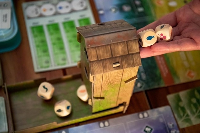 Gain food tokens via custom dice in a birdfeeder dice tower